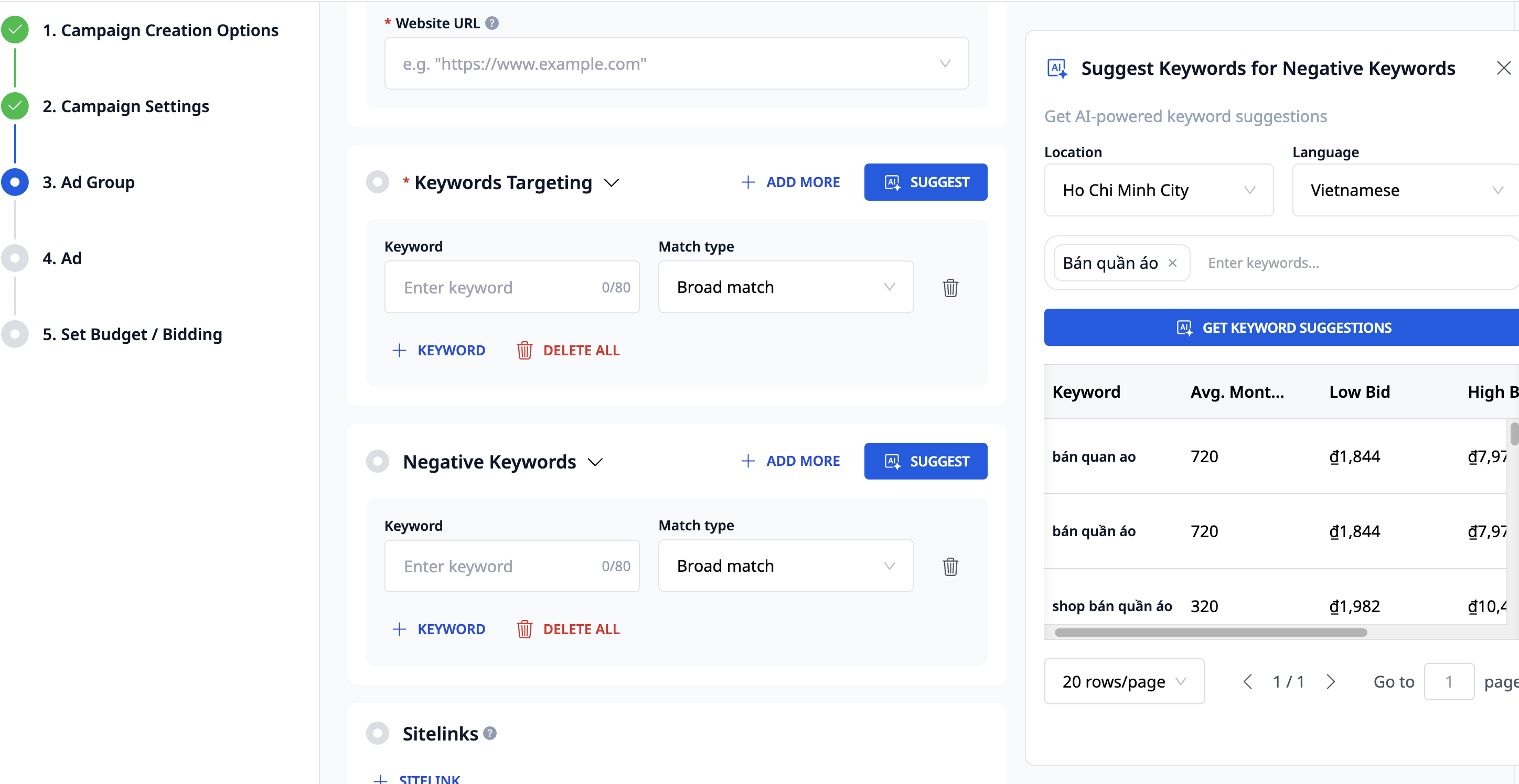 AI suggests keywords based on the website and keywords you provide