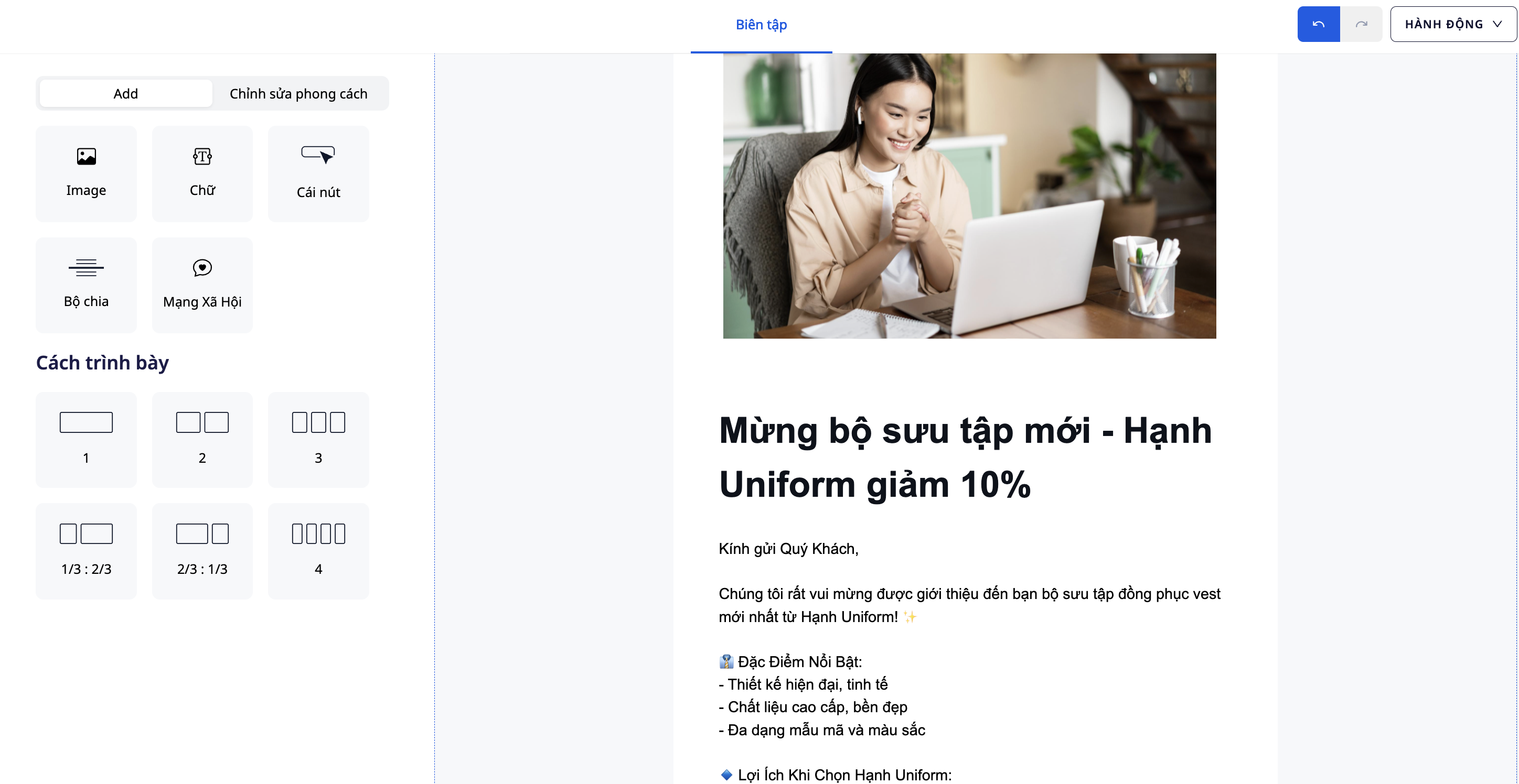 Ms. Hanh uses AI Email Builder to create a campaign to introduce a new collection for the business: