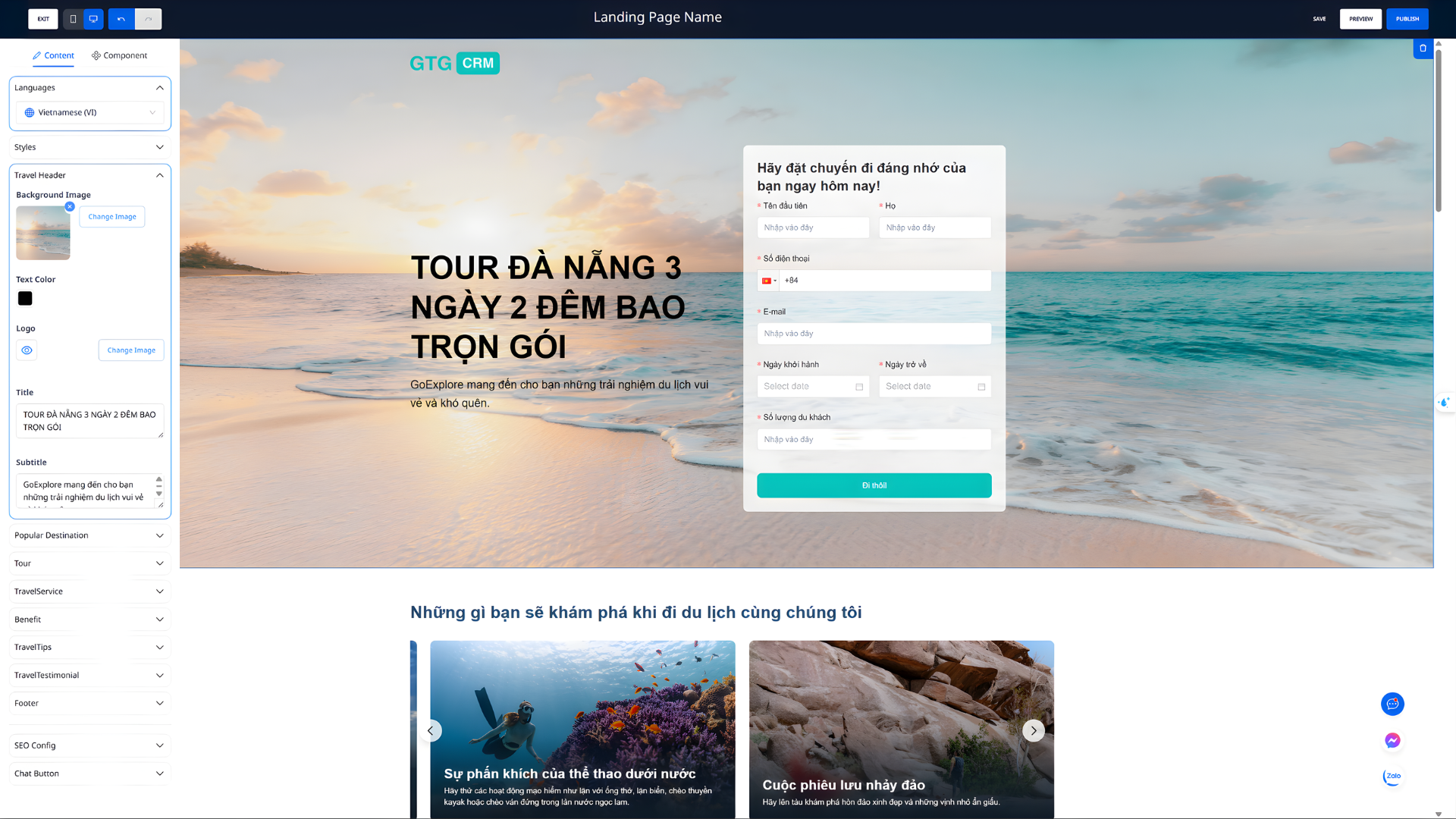 A ready-made system a library of Landing Page templates specialized for the tourism industry, with a built-in form to collect customer information to register for a tour.