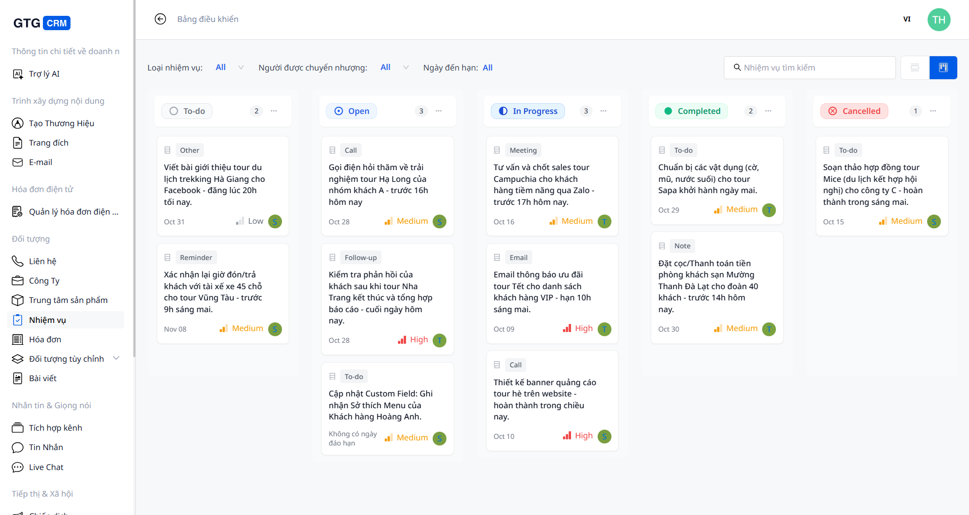 GTG CRM helps travel and tourism centers operate like a complete orchestra – from attracting customers, processing information, assigning tasks to post-tour care – all connected in a single platform.