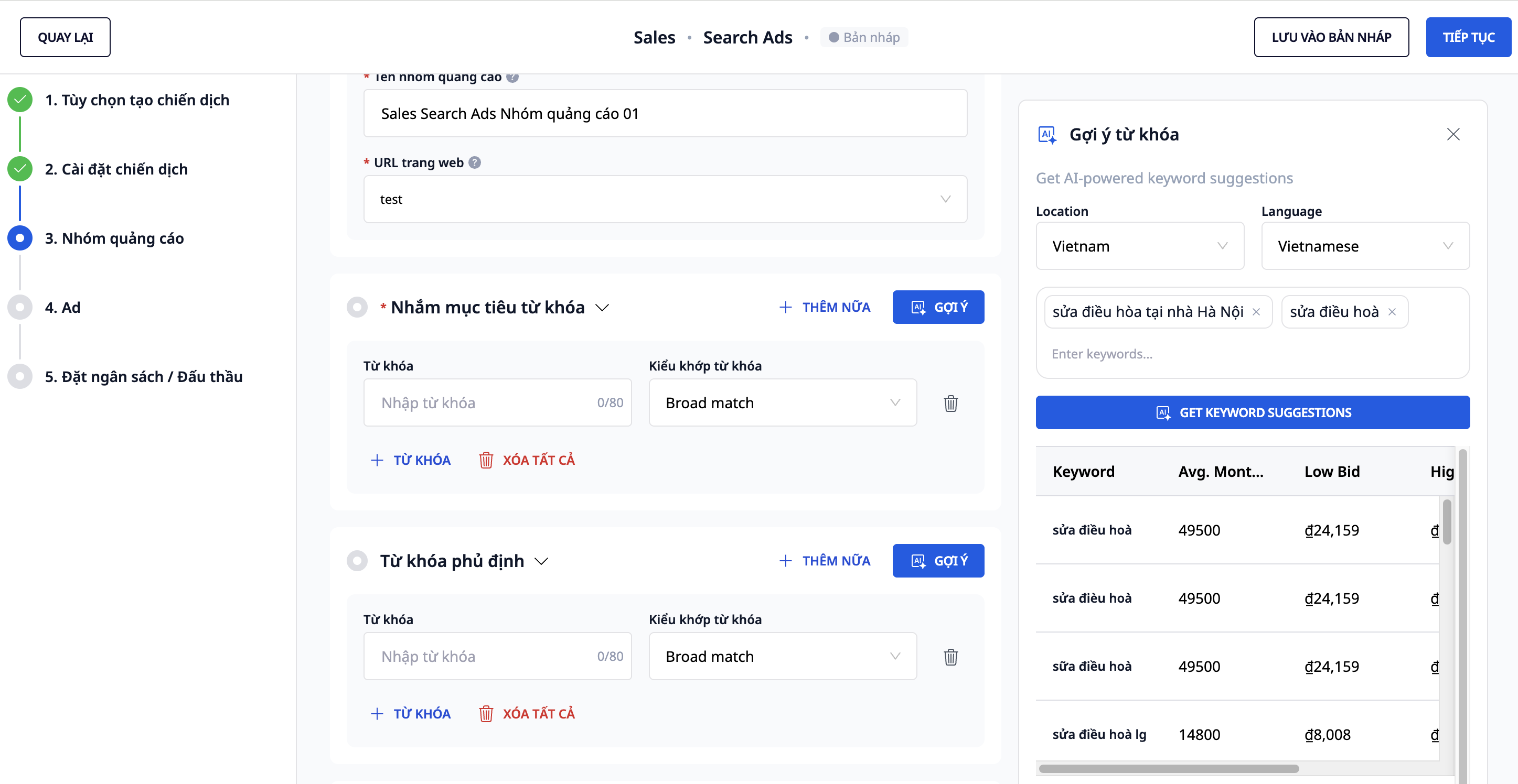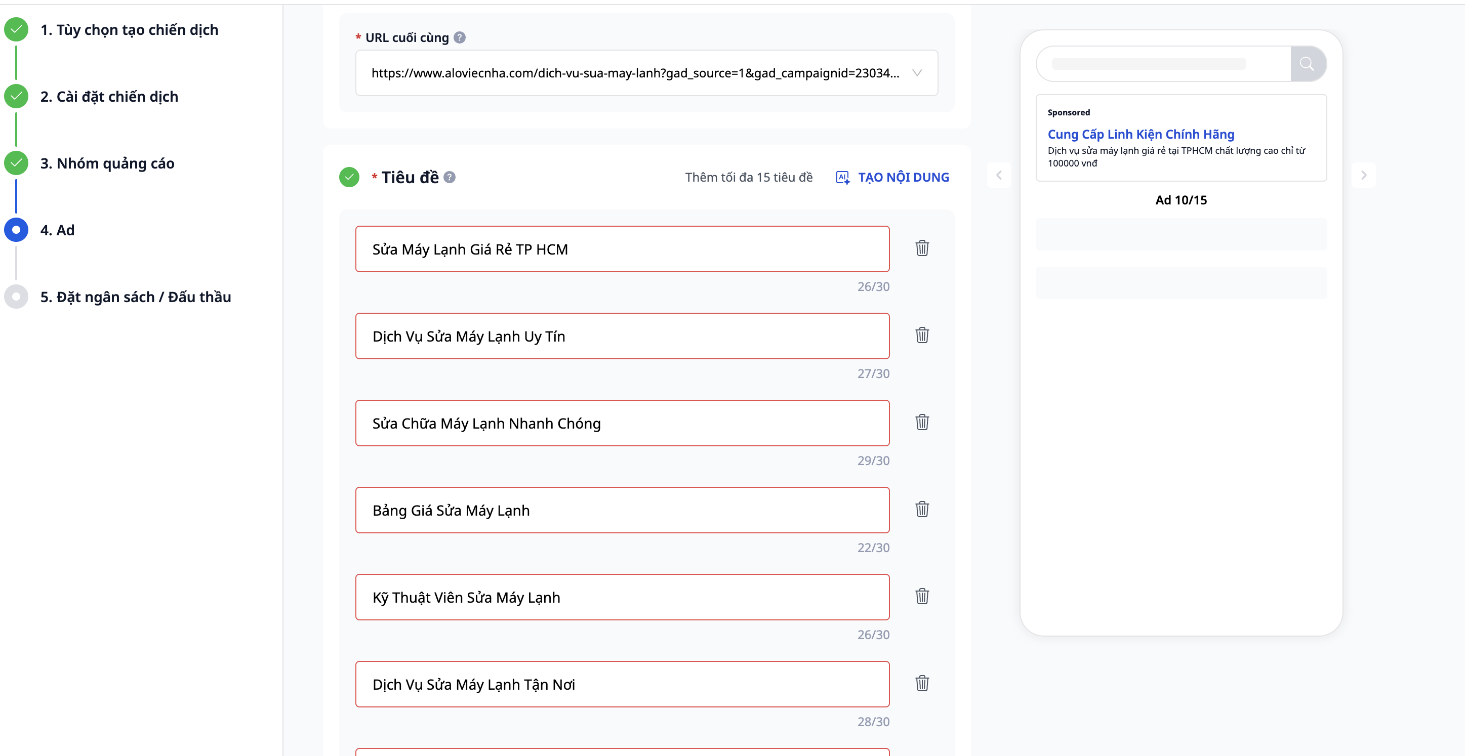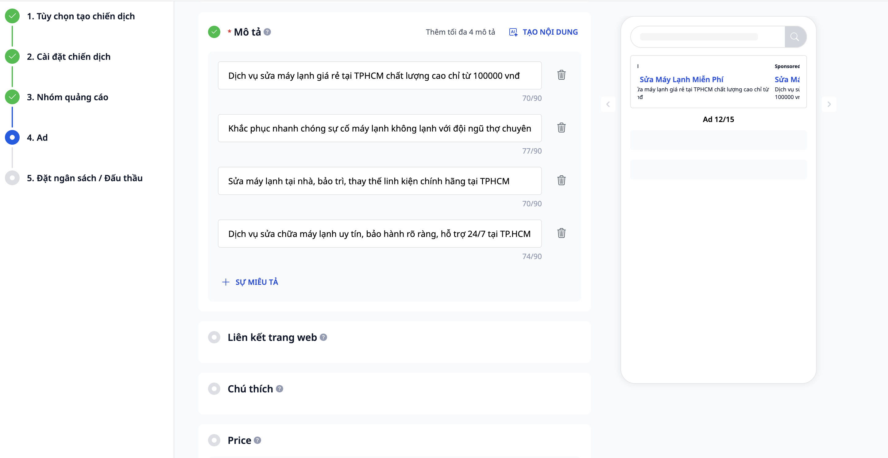 After the first days of testing, Mr. Nhat gradually realized the power of tracking data and tweaking small campaigns every day. He changed inappropriate keywords continuously, updated more attractive descriptions, and added a few phrases to emphasize service offers.