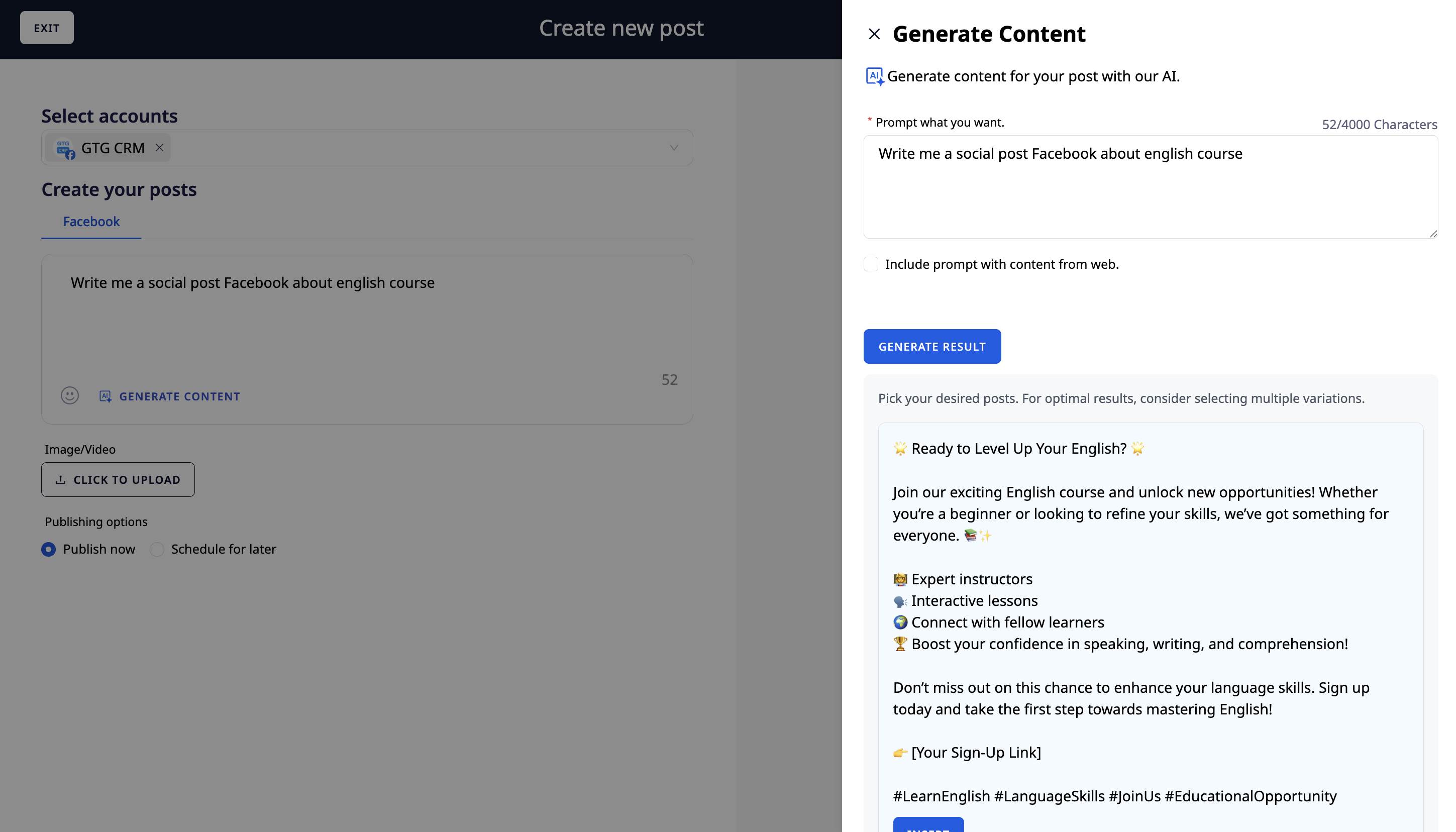 In addition, the AI integrated in GTG CRM also helps you create multi-platform posts and photos quickly.