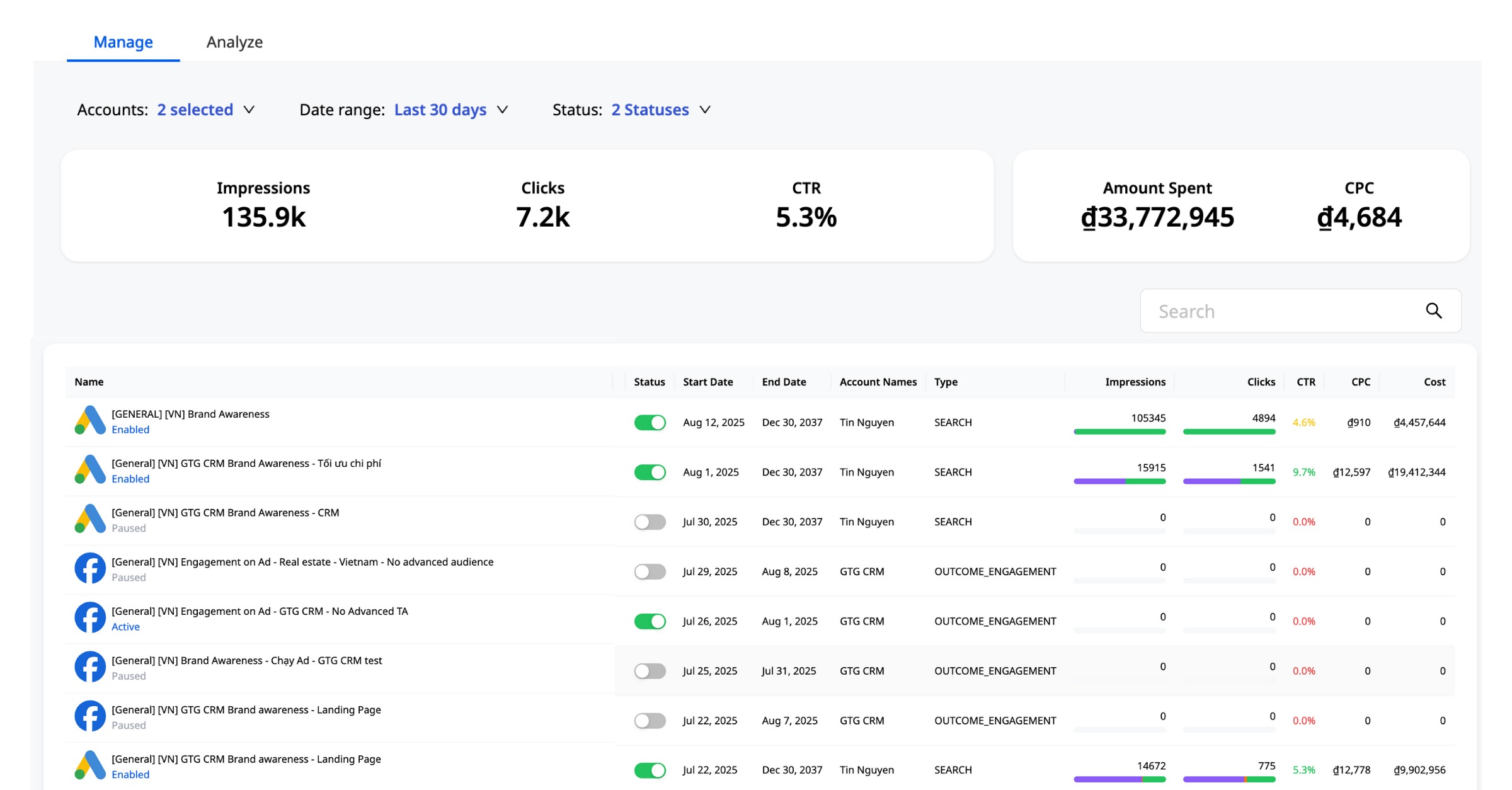 Instead of having to use each individual tool, you can see right in GTG CRM the number of reach, CTR or CPC, ... from posts or ads.