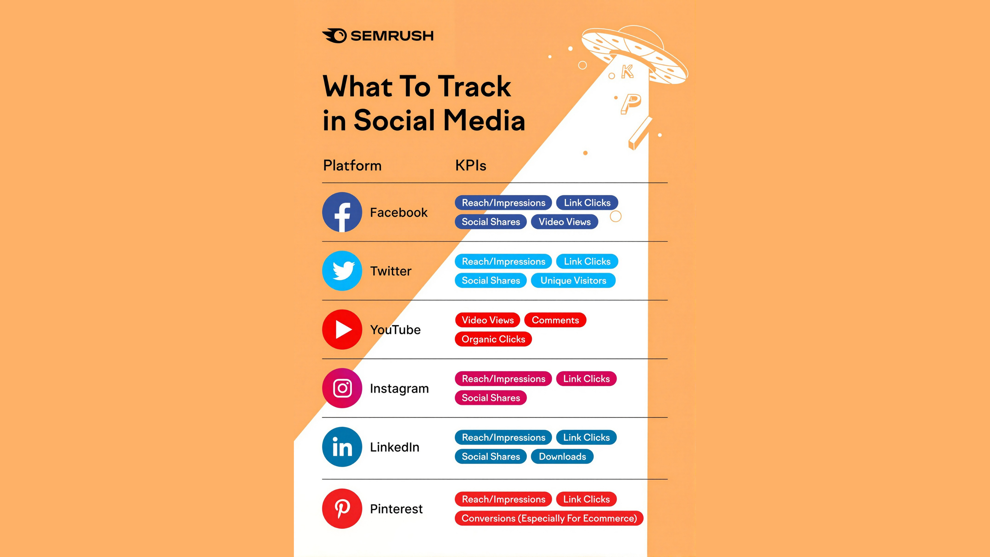 If you're still wondering which metrics to track for each social media platform, SEMRush has compiled a detailed guide that will help you easily identify and select the most important KPIs to measure campaign performance.