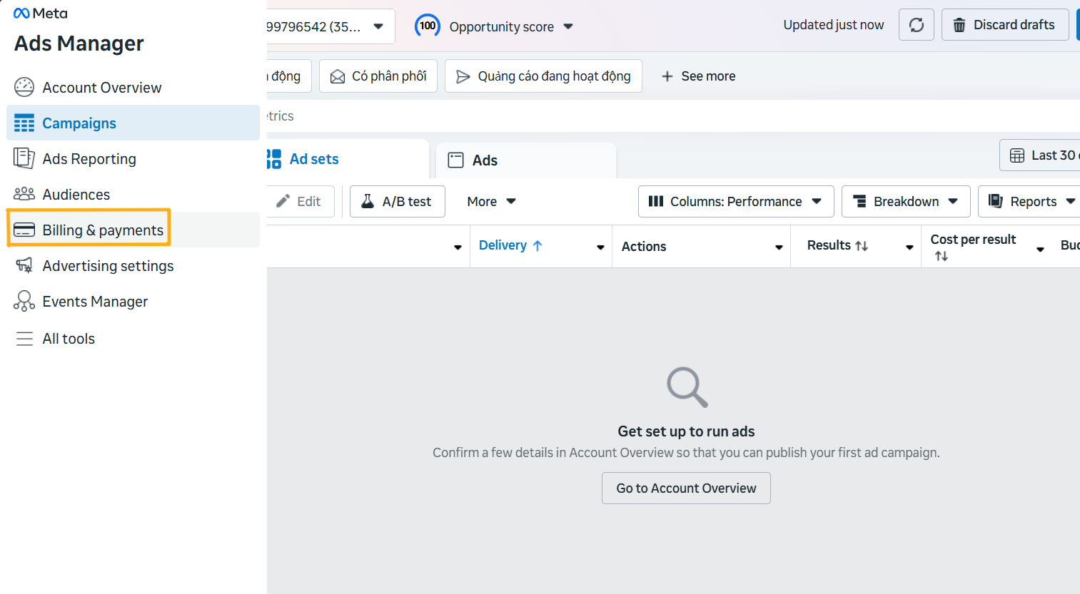 Step 2: Go to Ads Manager, this is where all campaigns, ad sets, and performance are displayed.