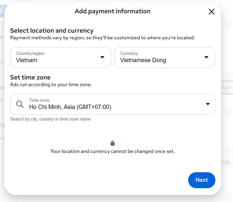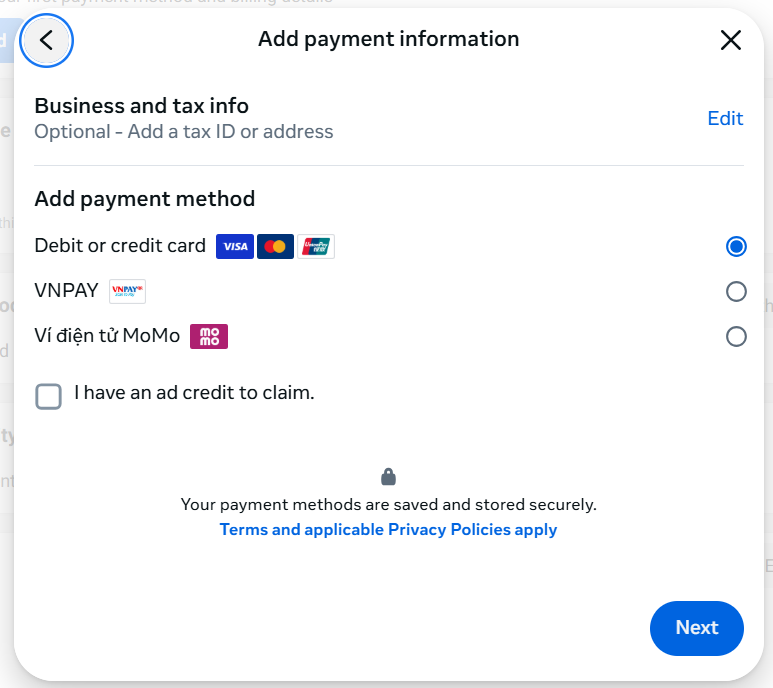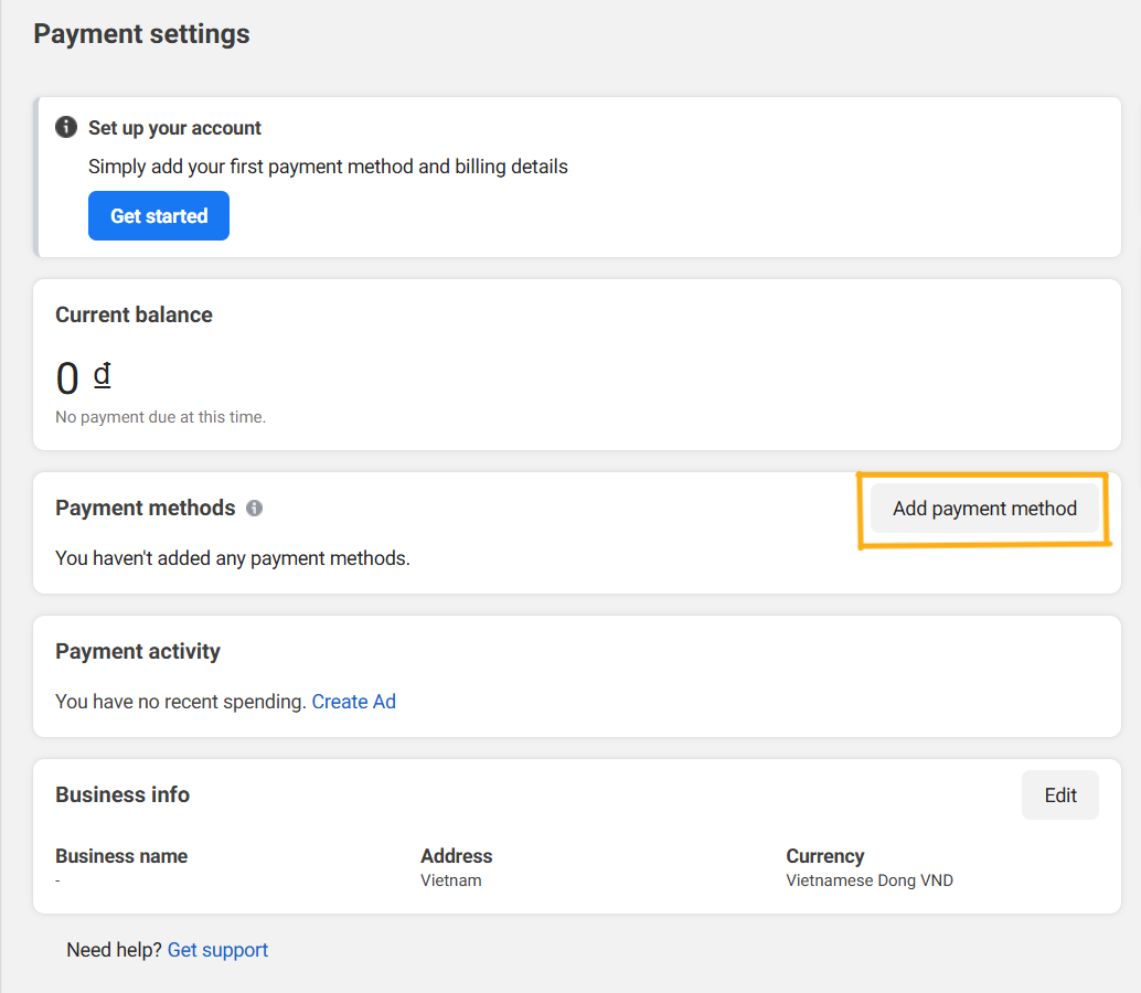 After having an account and Fanpage, the last condition for the ad to be able to work is the payment method. This is a mandatory condition for the ad to work. Facebook currently accepts: