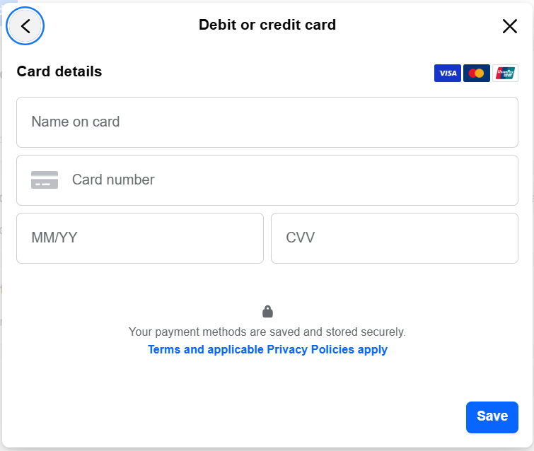 Step 7: Enter correct card information including card number, expiration date and CVV/CVC security code and click Save to complete