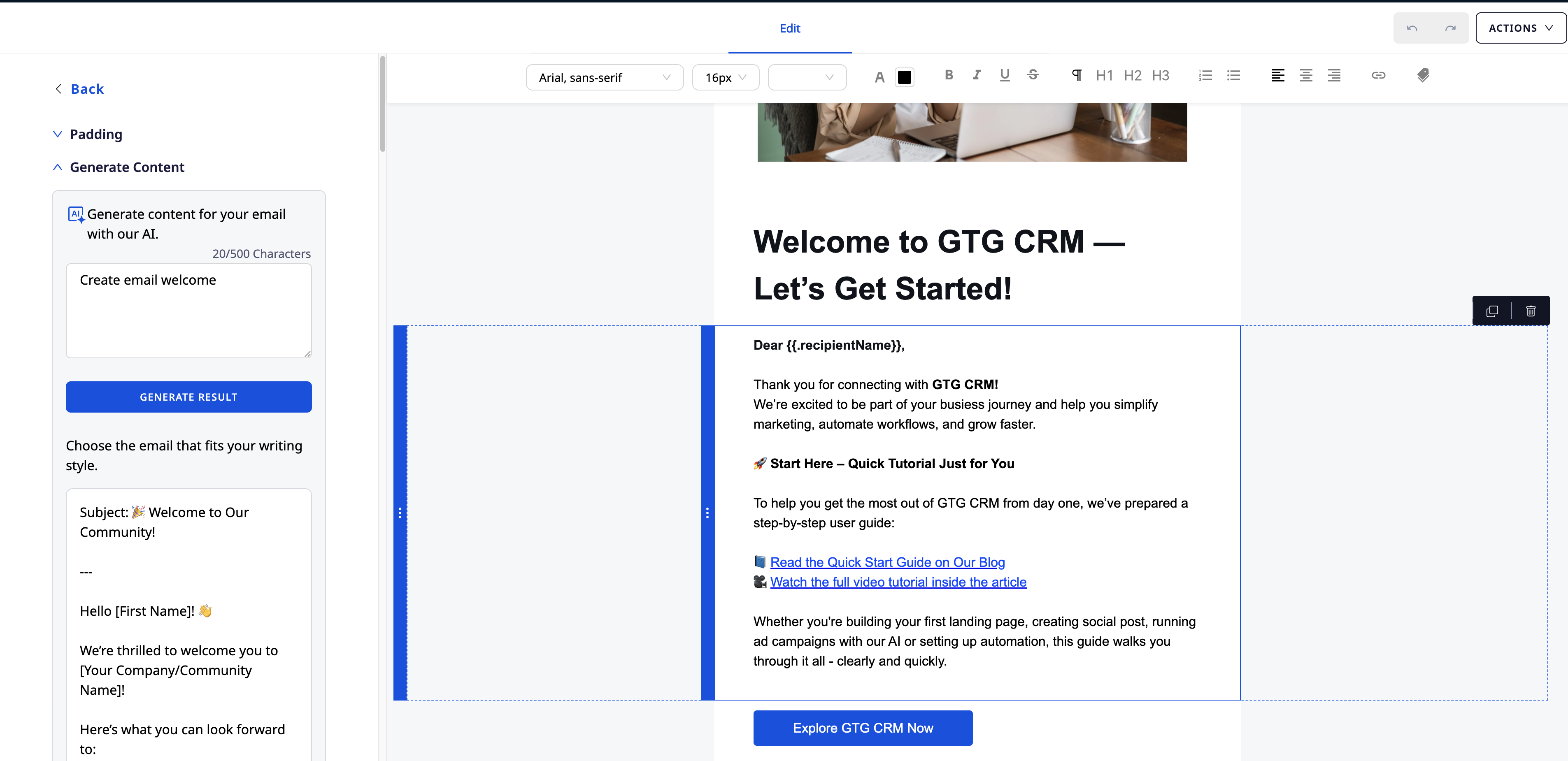 Email Builder: Compose marketing emails based on available templates combined with AI content generation and