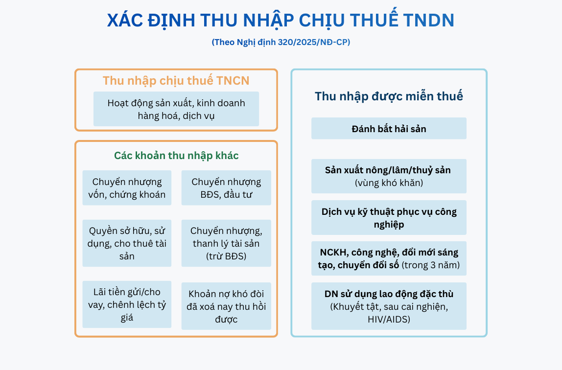 According to Decree 320/2025/ND-CP, taxable corporate income includes:
