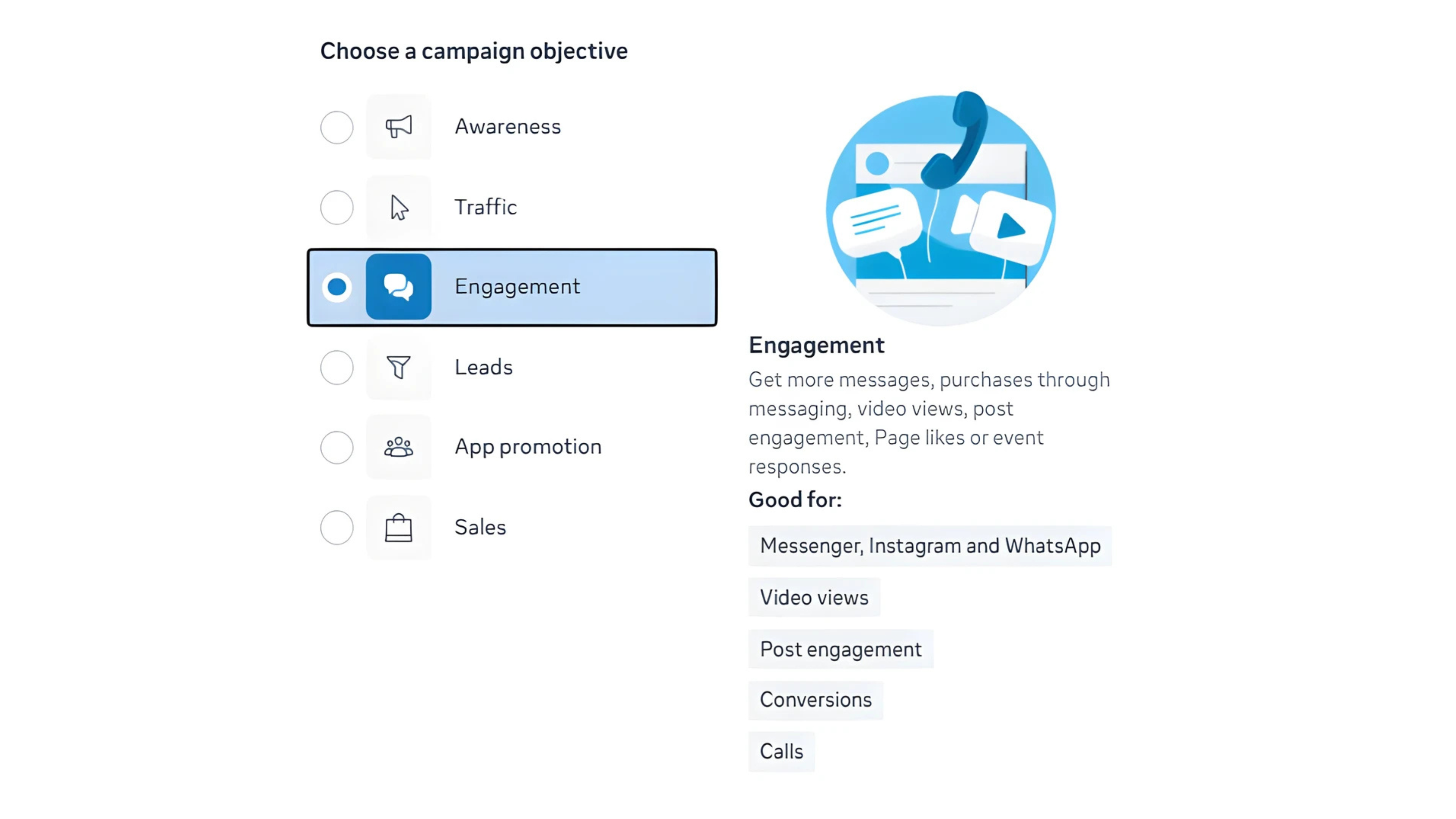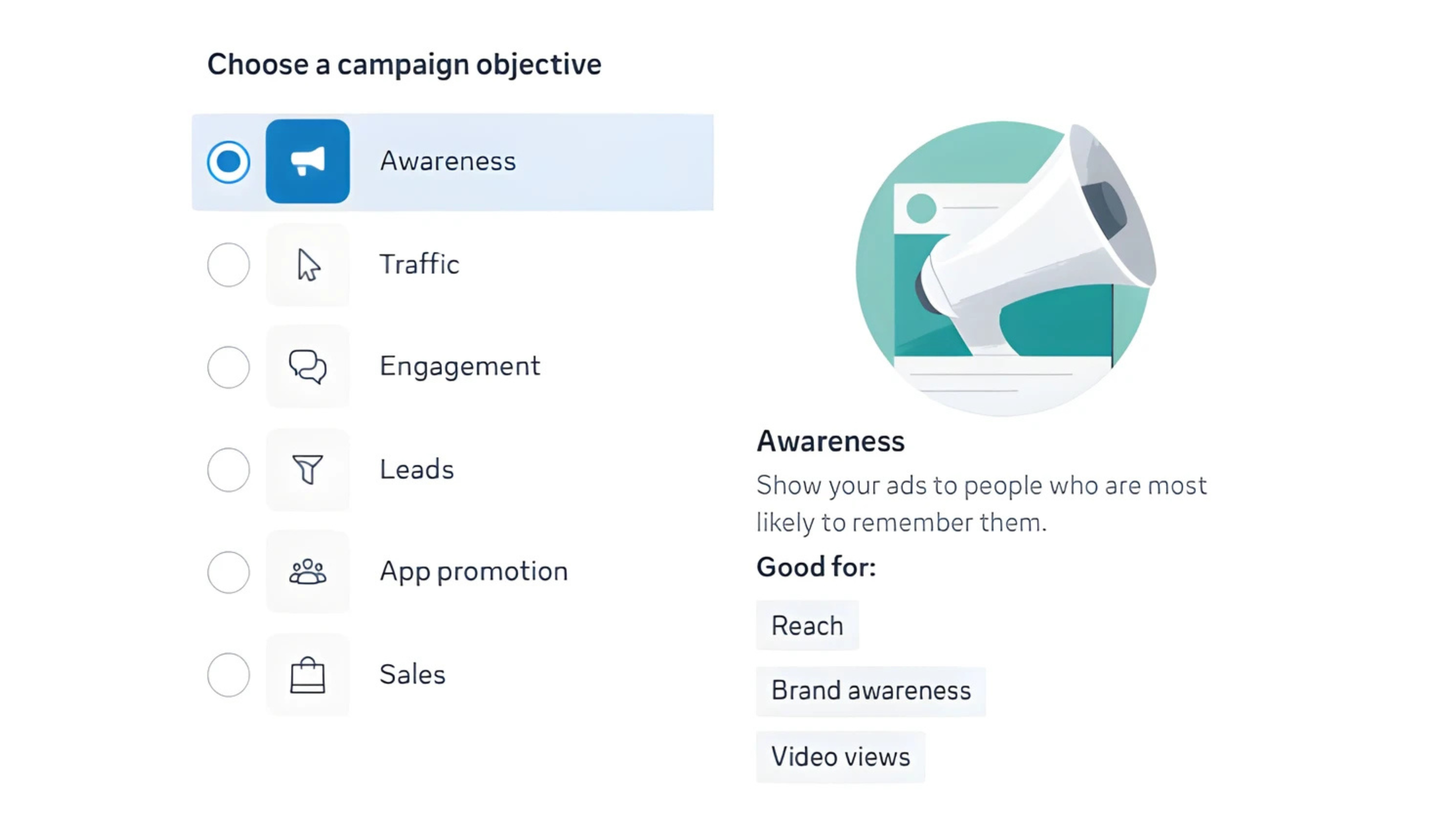 There is no single “best” goal for every situation. Recognition helps make the brand known, traffic brings customers to your platform, interaction creates trust, lead generation collects data, and conversion is the closing stage.