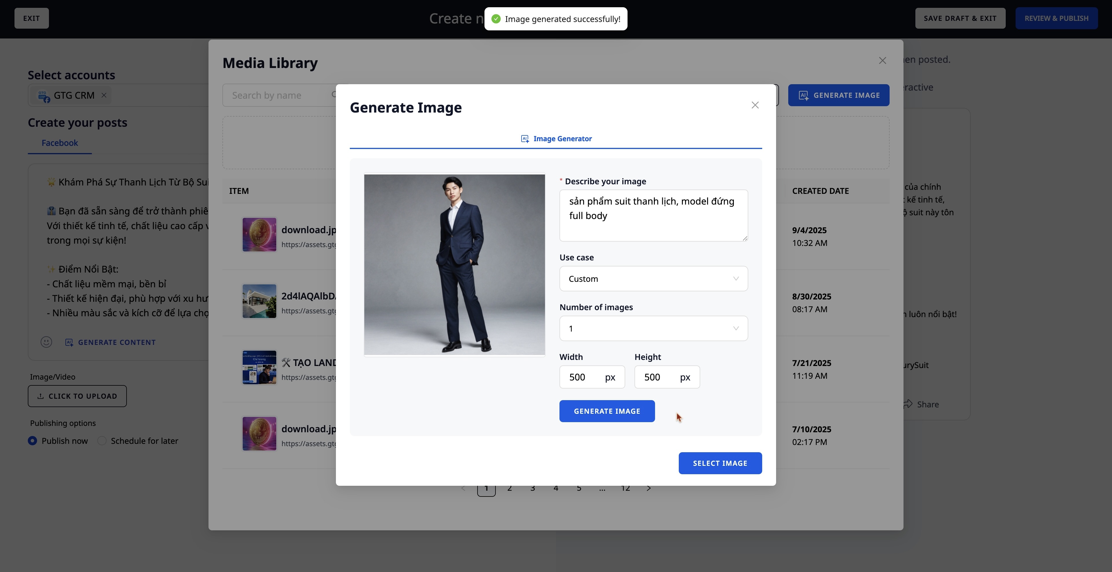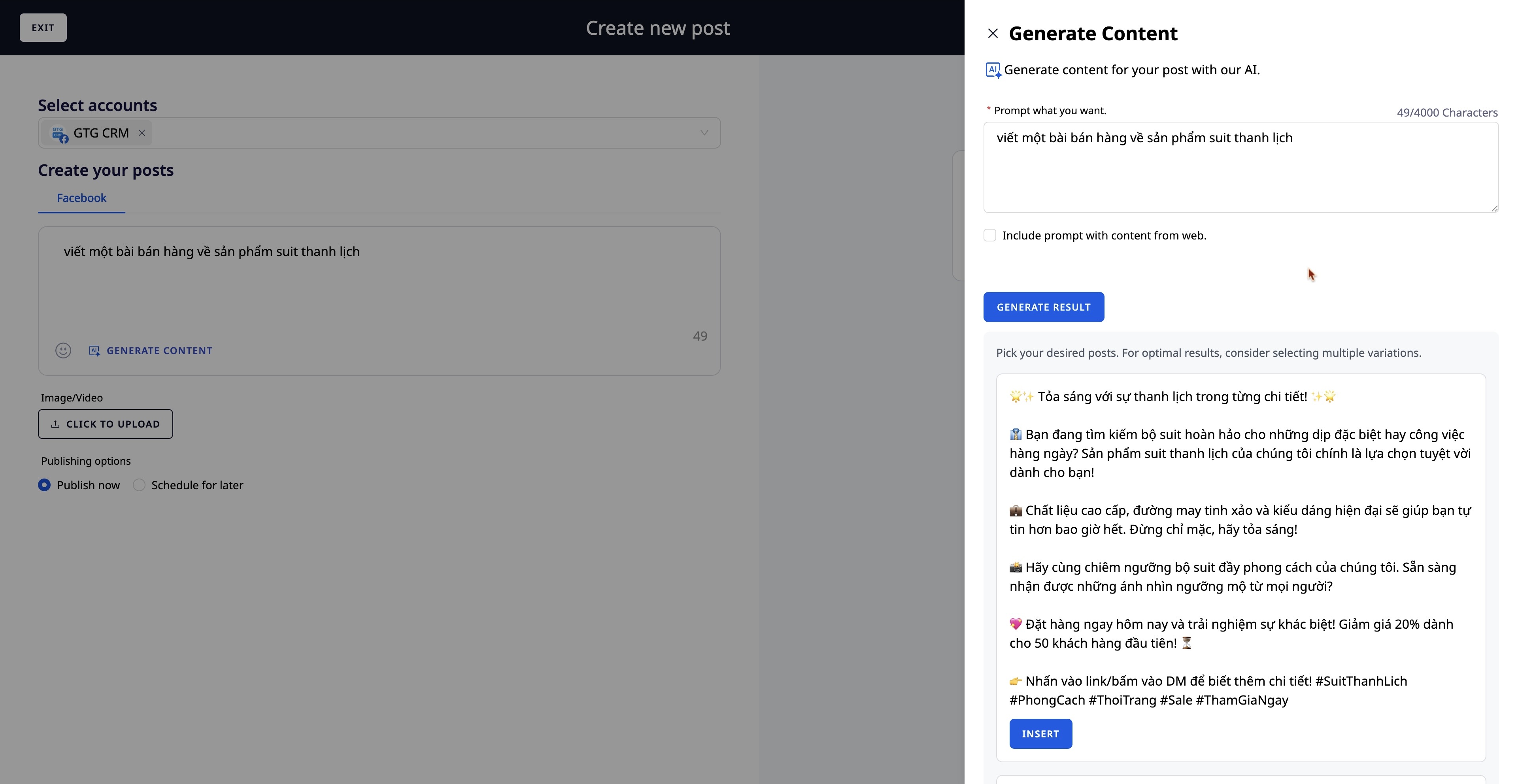 With Social integrated with GTG CRM's AI, this whole process is shortened to just a few minutes. You enter a few basic commands, and AI will automatically suggest captions according to the tone of each channel. You can also use AI to generate suitable illustrations or pull them directly from your Google Photos. Then, you can schedule posts for the entire week and let the system automatically report the results. At the end of the week, you just need to open the dashboard to see which channels bring the most effective interactions.