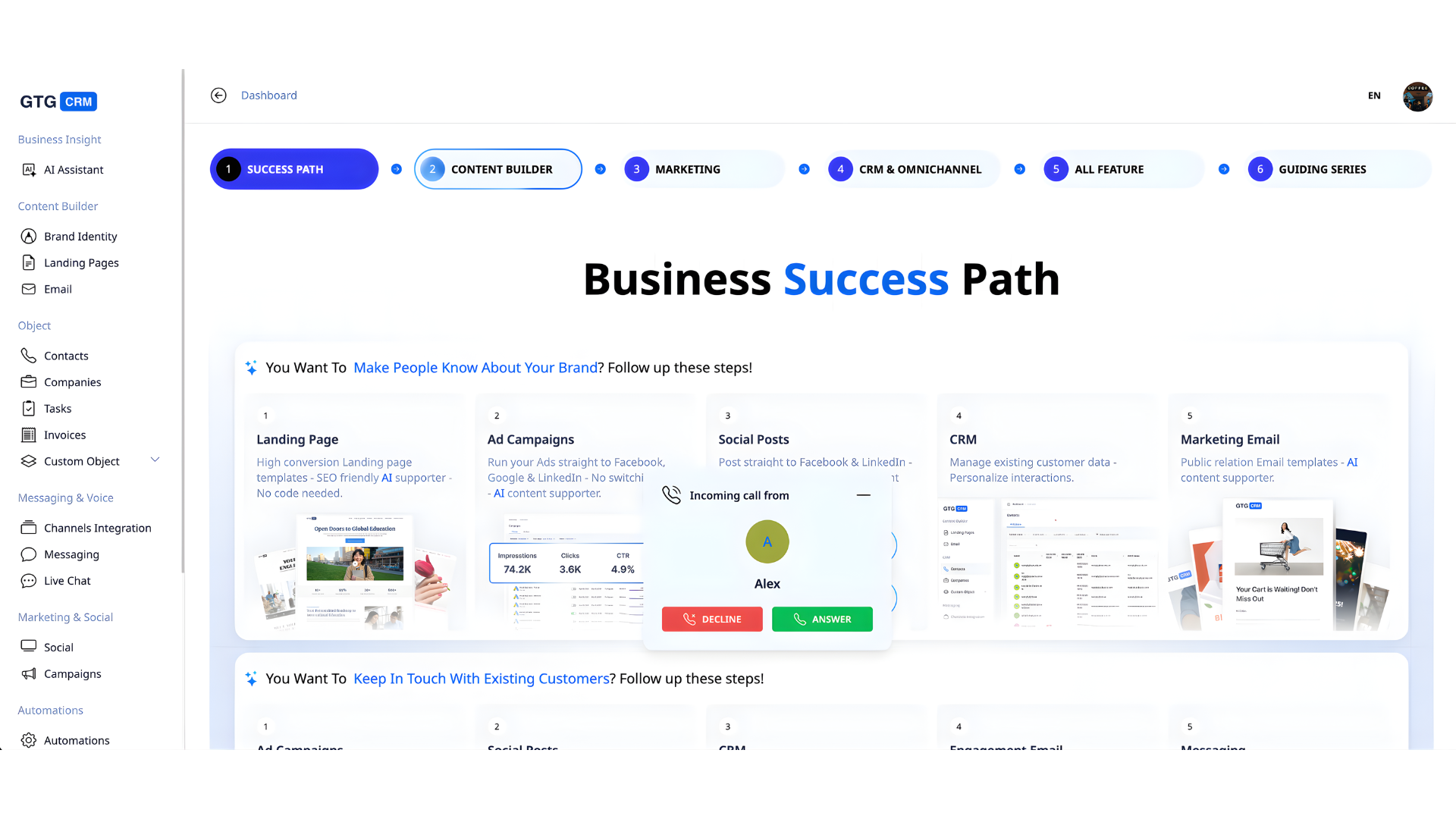 GTG CRM 通过集成 AI 和 CRM 的呼叫中心,帮助越南企业实现这一目标,使企业能够 快速呼叫 - 即时获取数据 - 提供始终如一的服务,所有操作均在同一平台上完成。